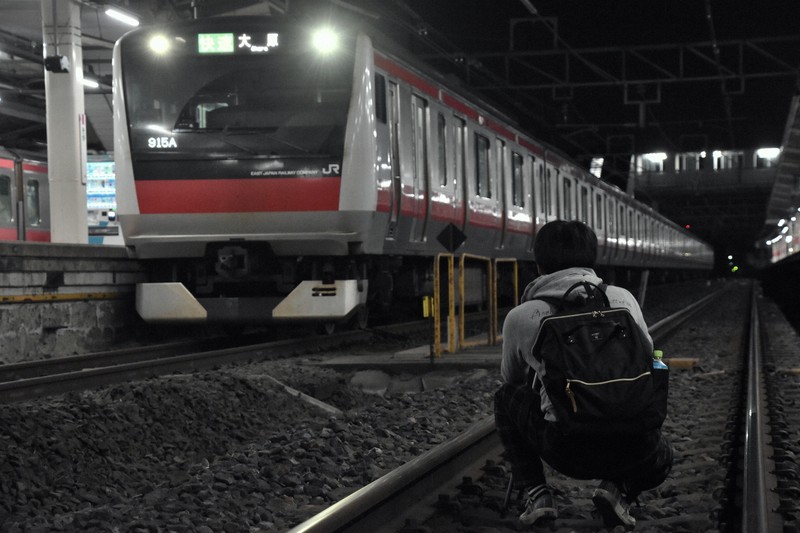午前1時~同3時半の開催にもかかわらず、県内外から26人が集まった。車両は現役の「E233系」2編成(各10両)で、ホームや線路の上からシャッターを切る機会が設けられた。