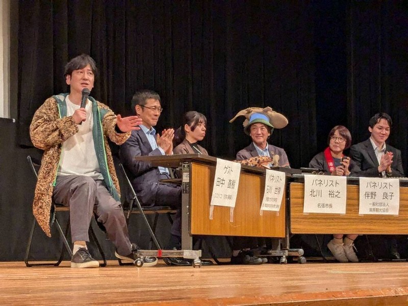 パネルディスカッションでは、生き物好きで知られる田中さんが、北川裕之市長や専門家らと語り合った。田中さんは名張市の生息地・赤目四十八滝渓谷を訪れた時、「岩と思って近づいて見ると、オオサンショウウオだった。あのサイズ感で岩に擬態するという、生物としての魅力がある」と振り返った。