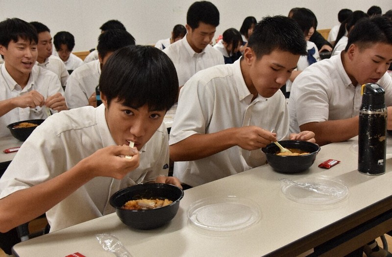 大学進学を目指し、将来は新商品を企画する仕事がしたいと夢を描く佐々木寛太郎さん(17)は「思いが伝わってくるカレー。この味を忘れずに頑張りたい」と大きなカツをほおばっていた。