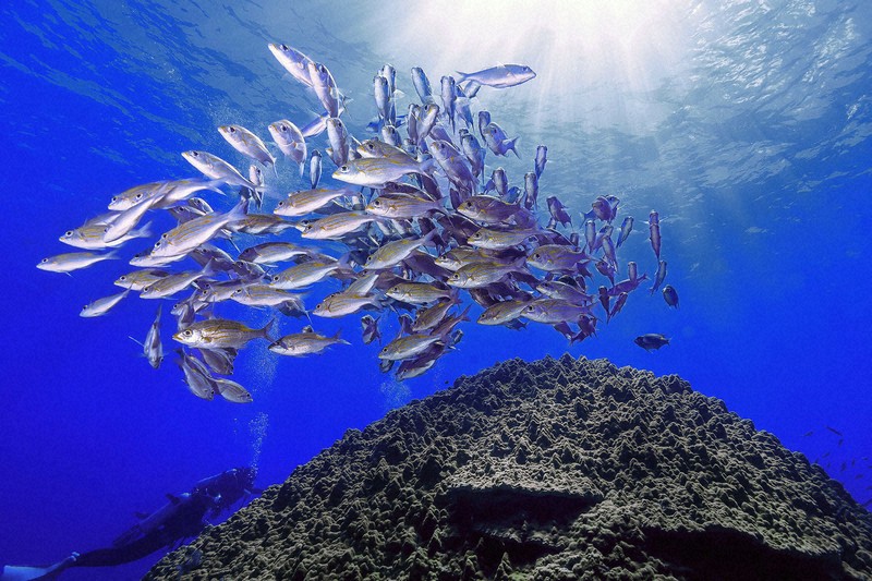 このボニンブルーの海に神々しいばかりの太陽光が降り注ぎ、天啓を受けたみこたちのように、ノコギリダイの群れが、形を変えながらゆるやかに舞を奉納しています。その後方には、大きなハマサンゴが堂々とした姿を浮かび上がらせています。陸上でも、円すい形の秀麗な山容そのものが神秘的な「ご神体」としてあがめられるように、このサンゴも神がかったものを感じさせてくれます。
