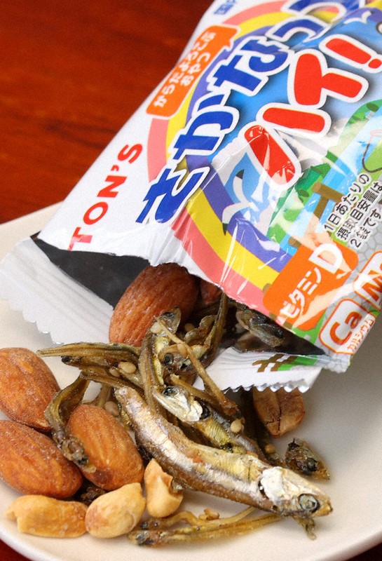 気になっていたのが、ナッツメーカーなのに、小魚の扱いが上手なこと。味や大きさが絶妙で、小魚のかけらが歯茎に刺さることがあまりなく、苦みも少ないですね。「使っているのは瀬戸内海などで水揚げされた国産のカタクチイワシ。食べやすいように、小ぶりのものを使っているんですよ」と大津山さん。オリジナルオイルでコーティングしてDHA(ドコサヘキサエン酸)などの成分を加えるとともに、小魚の水分がナッツに移らないよう気をつけている。