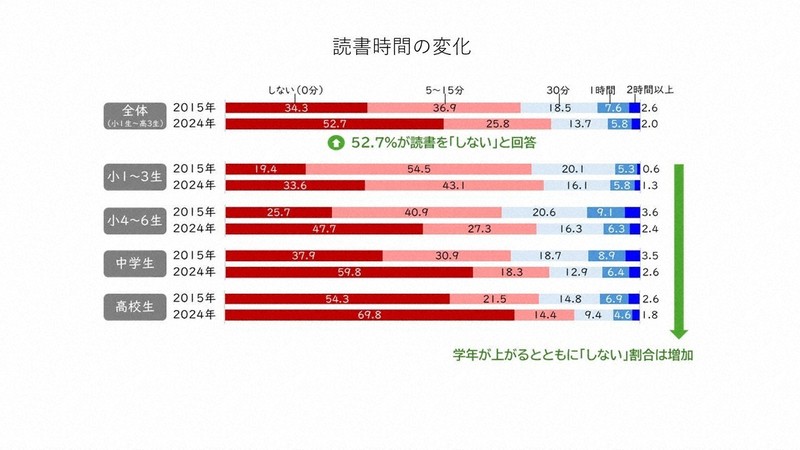 1日当たりの読書時間は全体的に減少傾向にあり、特に小4以上で減り幅が大きかった。15年から24年にかけ、小4~6では6・3分減って15・6分に。中学生は5・9分減って14・1分、高校生は4・9分減って10・1分になった。