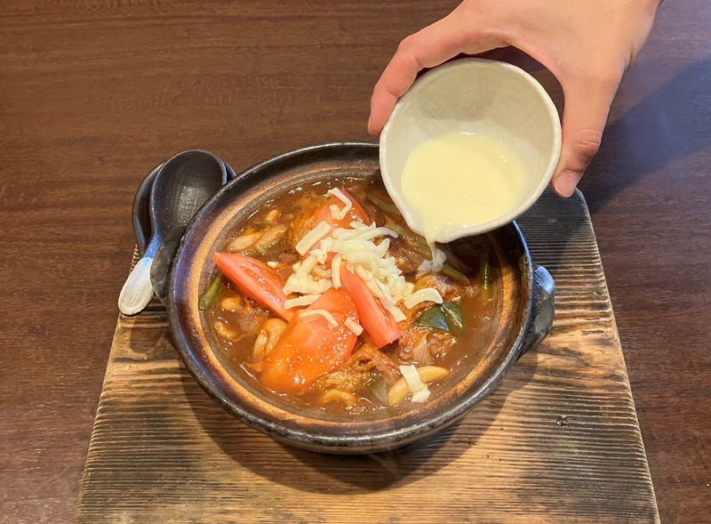 「湯気と戦え!ファイヤー味噌煮込みうどん」で、特製のトマト入りスープを火に見立てて、付属調味料の白チーズと豆乳を消火剤になぞらえた。スープに入れることで、味がまろやかに変化するという。