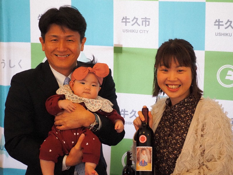 茨城県牛久市は6日、同市中央の牛久シャトー本館で、今年赤ちゃんが生まれた世帯に記念のワインボトルを贈る「親子のはじまりお祝いプロジェクト」のお披露目式を開いた。市内の親子4組が出席し、沼田和利市長がそれぞれの子どもの写真付きボトルを手渡した。【鈴木美穂】