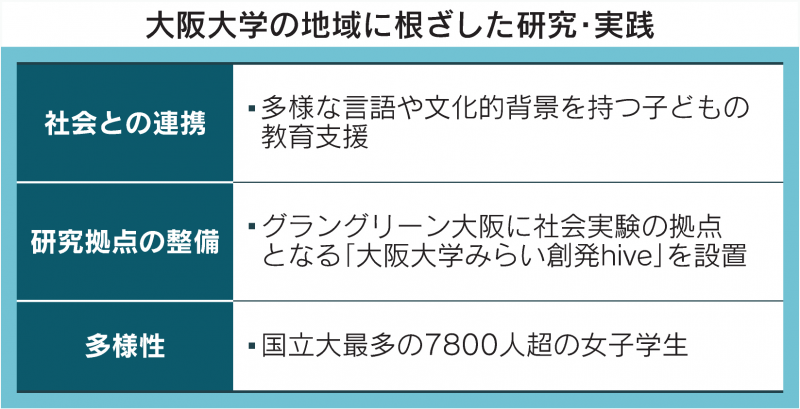 大阪大に在籍する女子学生数は7800人超と国立大最多。外国人留学生も積極的に受け入れている。大学から未来のダイバーシティー社会のあり方を示していく考えだ。人類の幸福に寄与する大学の本分を見つめ直し、地域連携でその可能性を広げる。