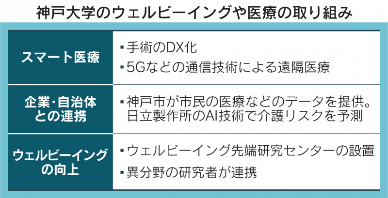 神戸大学はウェルビーイング推進に医療で貢献する。個人の健康情報を集めたビッグデータを人工知能(AI)で分析して診断・治療や疾病予測につなげる「スマート医療」の実現を目指す。