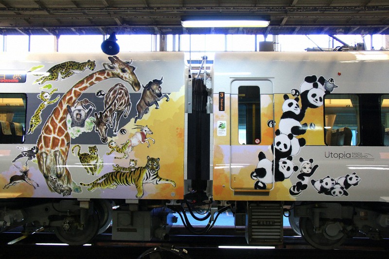 和歌山県白浜町の「アドベンチャーワールド」(AW)とJR西が手がけた三つ目のデザイン。車体正面や側面、車内の枕カバーなどに、色鉛筆を使ったような優しいタッチで動物たちが描かれている。AWで暮らしていた良浜(らうひん)ら親子パンダ4頭は今年6月に中国に返還されたものの、パンダくろしおの利用状況は好調といい、新しいデザインで「パンダロス」のファンにも楽しんでもらおうという狙いだ。