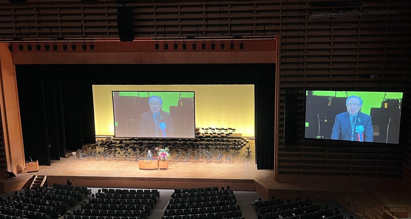 また、藤井輝夫・東大総長(学長)が「多様性の海へ」と題して記念講演。2部では両校の合同オーケストラが両校校歌を演奏し、お互い合唱して式を盛り上げた。各界で活躍する卒業生のビデオメッセージも上映され、がんの転移メカニズムの研究者、星野歩子・東大教授や直木賞作家の小川哲さんらがホールの後輩にエールを送った。