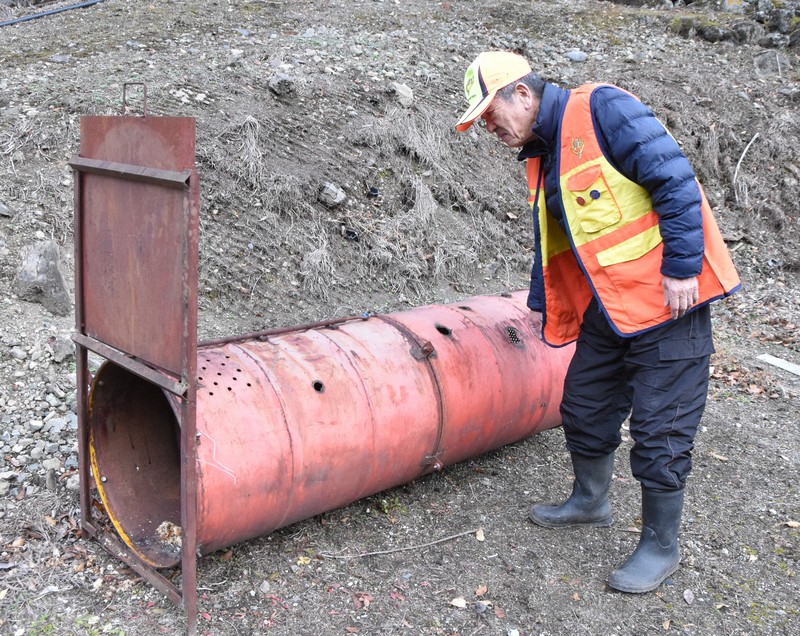 ドラム缶を溶接し、長さ2メートルほどの筒状にしたわなの奥には蜂蜜の箱が置かれている。クマが入って箱を動かすと、入り口が塞がる仕組み。中には無数のひっかき傷があり、クマが暴れた跡が残る。別の集落に設置していた3日前、ツキノワグマの雄1頭を捕獲したばかりだ。