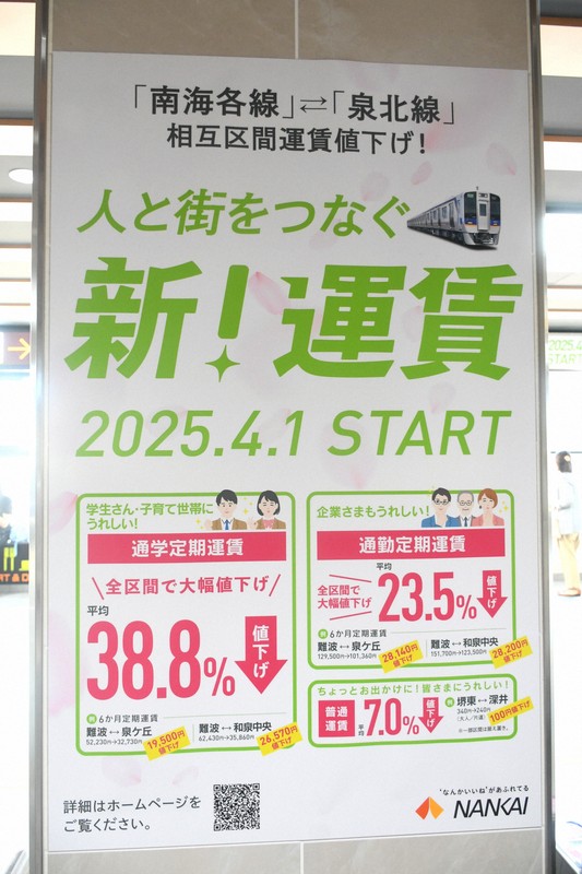 例えば、6カ月の通勤定期の泉北線泉ケ丘―難波間は従来の12万9500円から10万1360円に減額。6カ月の通学定期の和泉中央―難波間は従来の6万2430円から3万5860円と43%も値下げされた。
