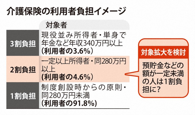 厚生労働省は20日、介護保険サービス利用時に2割負担となる人の対象を拡大した場合、新たに2割負担に該当する人でも、預貯金などの資産が一定の金額未満の場合は1割負担のままにする案を、社会保障審議会の介護保険部会で示した。2割負担の対象拡大は、これまで繰り返し検討されてきたが、高齢者の負担増につながることから、結論は先送りされてきた。厚労省は負担増に配慮する方向性を示しつつ、対象拡大に向けた議論を本格化する。