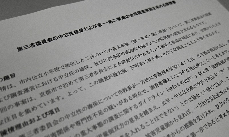 京都市教育委員会は1件目について、弁護士らを交えた第三者委員会による初の調査にも乗り出しているが、被害児童の保護者は「何度もうそをつかれてきた」と不信感を隠さない。第三者委のメンバー選考を巡っても保護者側の要望は届かず、2件目についての第三者委の今後は未定だ。