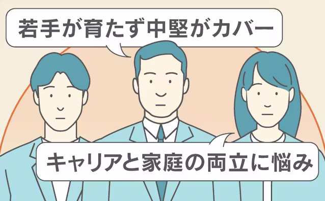 昭和を引きずる氷河期世代の働き方と、Z世代の新しい就業観との板挟み。リーマン・ショックや東日本大震災に伴う採用抑制で中堅が少ない職場。子育てや家事と仕事の両立の苦労。増える兆しのない給料……。