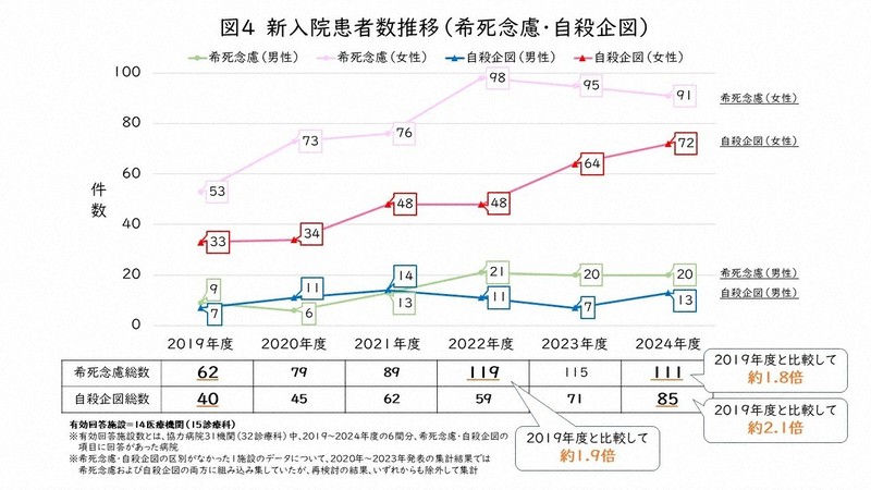 「死にたい」「消えてしまいたい」などと「希死念慮」を抱えて入院した人は、19年度の62人から24年度は111人に増加した。自殺を図って入院した人も40人から85人に増えた。成育医療研究センターは「厚生労働省と警察庁の調査でも自殺者数が増加しており、さらに多くの子どもが何らかのリスクを抱えていると考えられる」と懸念する。