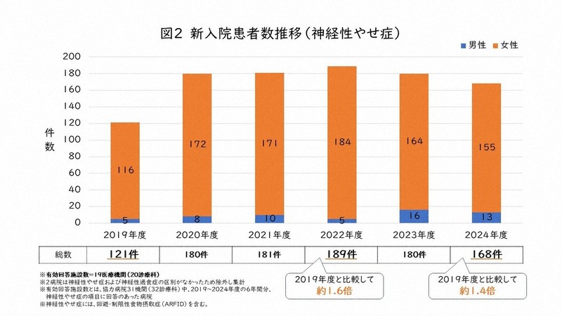 極端に食事を制限したり、食後に食べたものを吐き出したりする摂食障害「神経性やせ症」の入院数は、19年度の121人から20年度には180人に増加し、23年度まで同水準で推移。24年度も168人と高水準だった。子供の神経性やせ症を治療できる医療機関は少なく、20年度以降は慢性的に病床が不足。利用可能な病床に対し、患者が30%上回る病院もあったという。