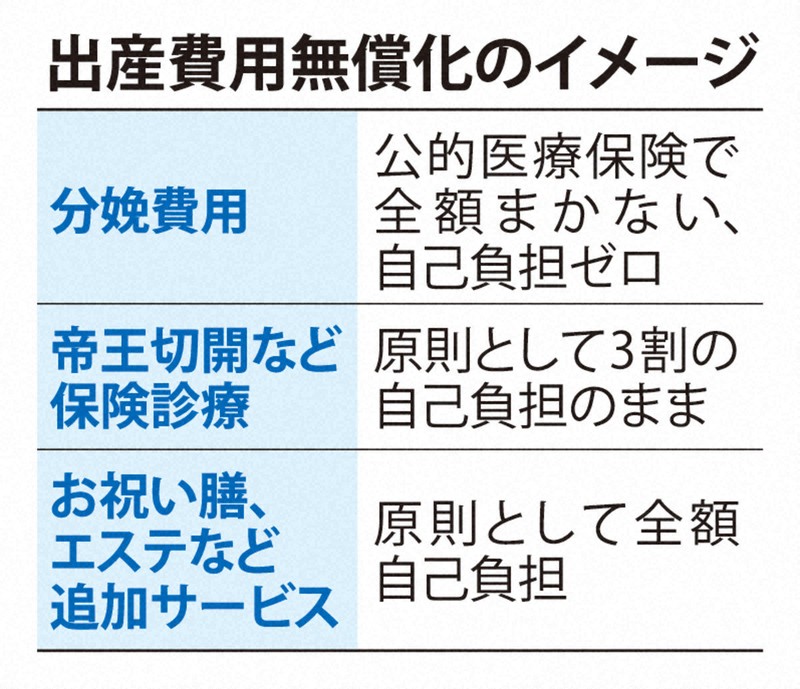 少子化対策の一環で、出産の経済的負担の軽減が目的。帝王切開など分娩に伴う保険診療は、現行の3割の自己負担を継続する方向だ。「お祝い膳」やエステといったサービスは自己負担を軸に検討を進める。