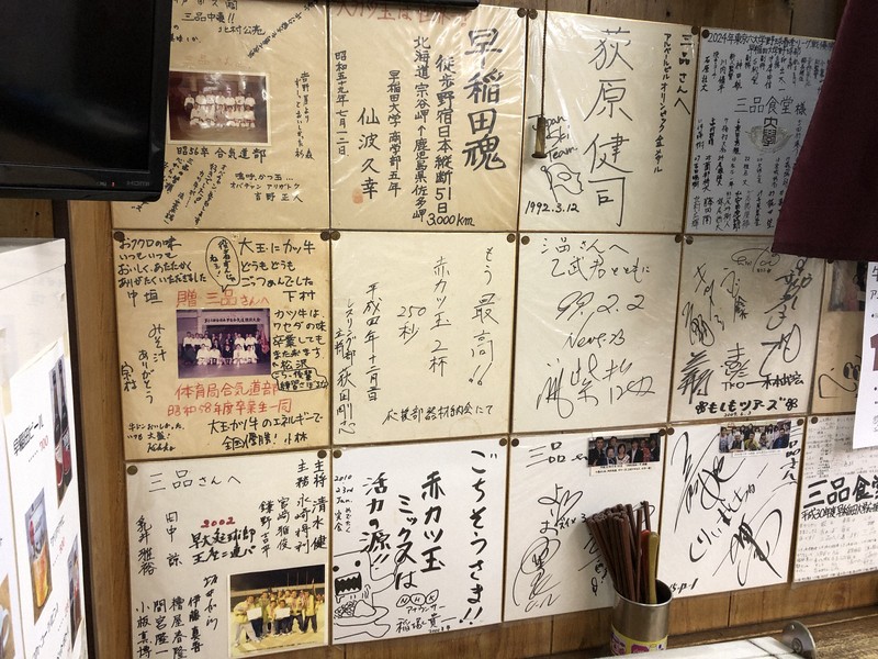 現在、営業は月~金の午前11時半~午後2時。第1、3土曜も営業。店内には、常連客や卒業生らの多くの色紙が残る。