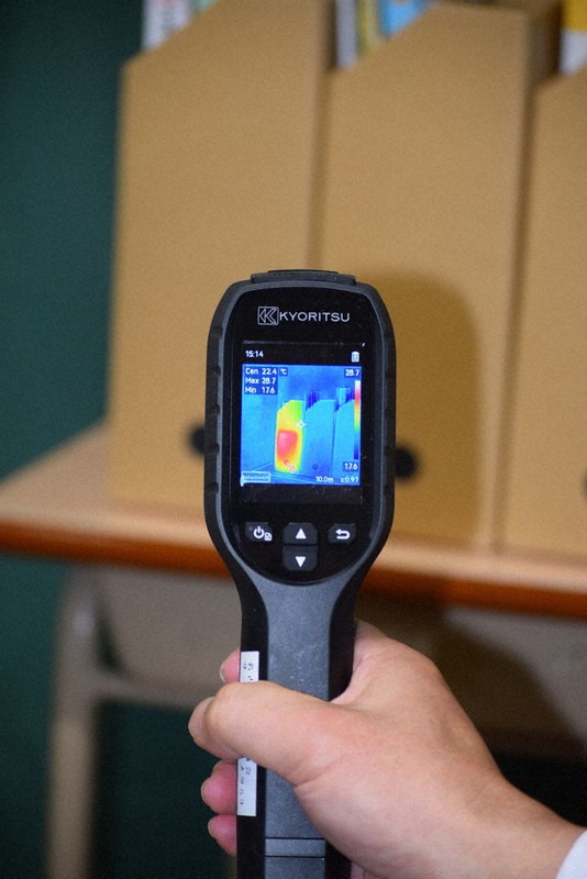 市教委によると、探査機はサーモグラフィーカメラで、隠しカメラのバッテリーが発する熱を検知する仕組み。すぐにできる再発防止策として、55台を計約250万円で購入した。