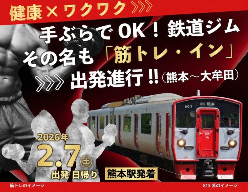 筋トレ・インは、2両編成の特別貸し切り列車を約4時間運行。熊本保健科学大(熊本市北区)の学生がトレーニングを指導し、昼食には「プロテイン食堂」(同市中央区)が手掛けた「プロテイン弁当」が提供される。