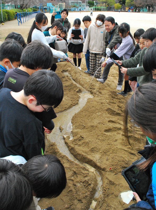 授業を見守った四天王寺大の仲野純章准教授は「実験は『流れる水のはたらき』という理科の単元に関するもの。防災教育を連動させると、水の供給元から水の流れ、流域といった系(システム)の中で起きるさまざまな現象が関連づけられていく。系として考える力を身に付けることがより多様で複雑な現象を理解し、想像する基盤につながる」と指摘した。【大川泰弘】