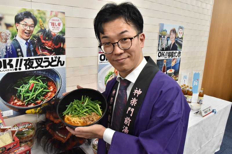 「夜叉うどん」のPRを務める神楽門前湯治村(安芸高田市)の役員で「うま辛伝道師」こと江種恭匡さん(41)は「安芸高田のネギをふんだんに使い、刺激的な辛さの後に、芳醇(ほうじゅん)なうまみがやみつきになる一杯になっている」と言う。