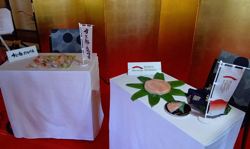 北九州市の武内和久市長は、サワラやタイラギの貝柱といった近海物を中心に、生のウナギなど12種類の握りを、富山県の新田八朗知事は天然のサクラマスとササを使ったます寿司(ずし)を準備し、互いに振る舞った。