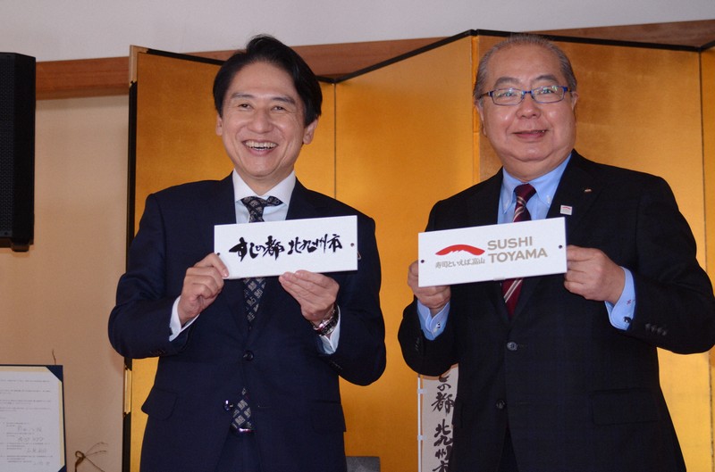 すしのブランド戦略を進める北九州市と富山県のトップ同士による2回目の「すし会談」が19日、北九州市小倉北区の小倉城庭園で開かれた。すしをテーマにした旅行商品を発表したほか、他の自治体も巻き込んだ「すしサミット」構想などについて語り合った。