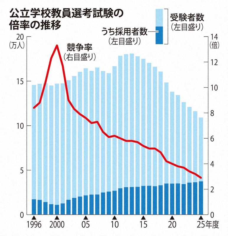 2025年度の公立学校教員の採用倍率は前年度比0・3ポイント減の2・9倍となり、過去最低を更新した。文部科学省が25日に公表した調査結果で判明した。倍率の低下は8年連続で、一般的に人材の質を維持するために必要とされる3倍を初めて下回った。大量退職に伴う採用者の増加に受験者数が追いついていない。文科省は労働環境の改善のほか、選考時期の早期化などの対策を自治体に促しているが、低下に歯止めがかからない状況だ。