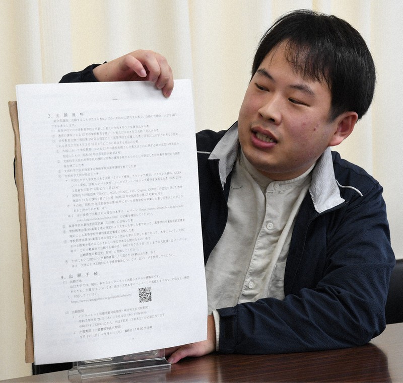 山口大学(山口市)が2026年度以降の入学生の授業料値上げを公表する前に総合型選抜を受験して合格した高校3年生の父親が23日、県庁で記者会見し「授業料は進学先を選ぶ重要な要素の一つ。値上げを知らずに出願した受験生らに連絡はなく、入試のさなかに値上げを公表する進め方は乱暴で稚拙に感じる」と訴えた。