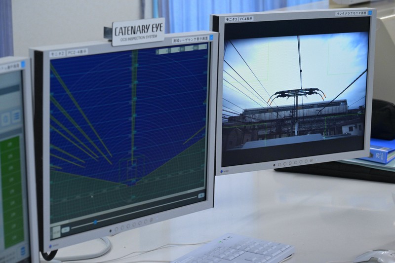 車内には長い机があり、ずらっとモニターが並びます。半分が架線検測用、もう半分は軌道検測用で、それぞれ2、3人の検測担当者がつきっきりでチェックします。