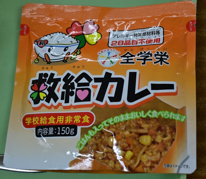 子どもたちが非常食を体験することで災害時の対応を学ぶ防災教育の一環で、センターが初めて企画した。救給カレーは、東日本大震災(2011年)をきっかけに、全国の栄養教諭と学校栄養職員が、ライフラインが途絶えた中でも食べることができるようにと考案。ご飯も混ぜられた1袋150グラム入りで、アレルギーの原因となる特定原材料28品目を使っておらず、温めずにそのまま食べられる。