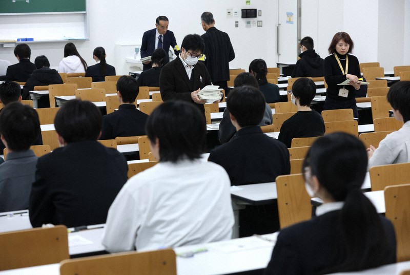 九州大学伊都キャンパス(福岡市西区)では、試験開始直前まで勉強する受験生や応援する教諭の姿が見られた。