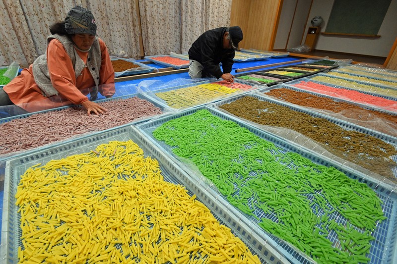 福岡県築上町の寒田(さわだ)地区で、冬のあられ作りが最盛期に入った。色鮮やかなじゅうたんを敷いたように生あられが陰干しされ、出荷の日を待っている。