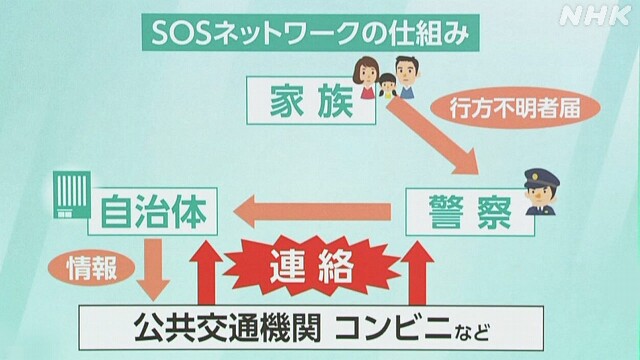 行方不明になった時に、家族が警察に届け出るとSOSネットワークに加盟する地域の公共交通機関やコンビニなどに行方不明情報が共有されます。