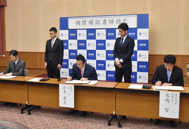 JR東海と静岡県は、リニア中央新幹線静岡工区のトンネル工事で大井川中下流域の水量が減った場合、JR東海が住民に補償することで合意し、丹羽俊介社長と鈴木康友県知事が24日、県庁で確認書に署名した。工事との因果関係の調査はJR東海が専門家の知見を得ながら実施し、国も対応に関与する。