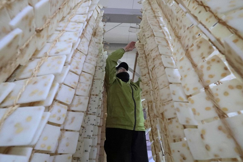 石川県白山市の農事組合法人「井関生産組合」では、かき餅作りが大詰めを迎え、作業場では出荷を待つかき餅がカーテンのようにつるし並べられている。