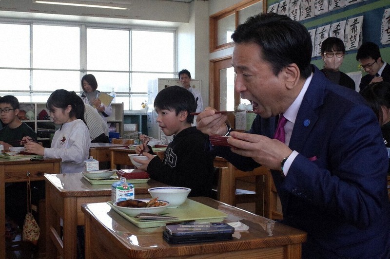 日新小では給食メニューのサバの揚げ煮や、野菜の端材を交えたキンピラなどに加え、6年生にふりかけが配られた。山口知事が「食べ物の端っこを大切に生かすことをみんなで考えてください」などと語りかけながら一緒に味わった。