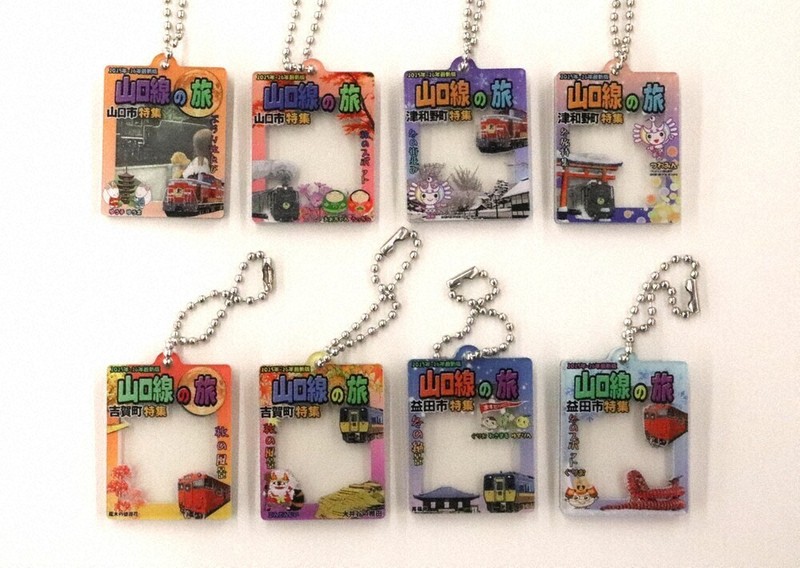 JR山口線沿線4市町の名所やご当地キャラクターをあしらい、フォトフレームとしても活用できるキーホルダー「山口線の旅コレクション」全8種が登場した。