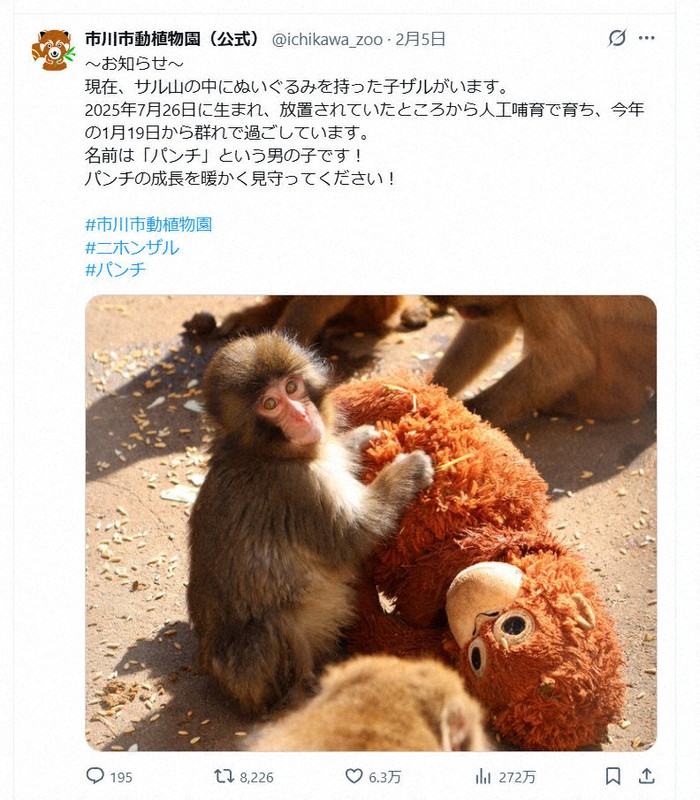 千葉県市川市の市川市動植物園の公式X(ツイッター)で紹介された子ザル「パンチ」が話題だ。