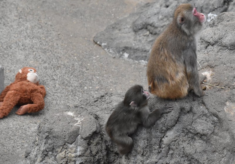 「現在、サル山の中にぬいぐるみを持った子ザルがいます」