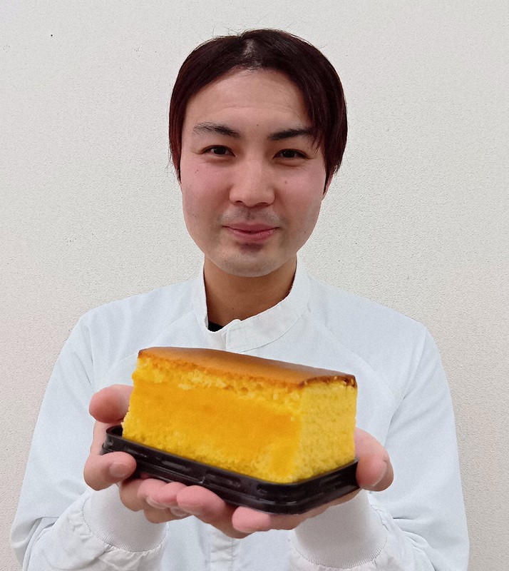 これらを混ぜ合わせた生地を縦約75センチ、横約65センチ、高さ約5センチの木の型枠に流し込み、オーブンで約1時間焼く工程に入る。ここからが正念場だ。「均一に焼けるよう、泡切りといって3~4回は生地をかき混ぜます。オーブン内の温度が下がらないよう、いかに素早くやるかが大事」と、担当6年目の係長、田村哲也さん(35)は語る。