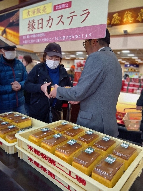 焼き上がったカステラは、新型コロナウイルスの流行前は店頭に運ばれ、来店客の目の前で切り分けられていた。総本店の高沢武利店長は「縁日にお参りにいらっしゃるお客様に、何か特別なおもてなしをしたいと20年ほど前からカステラの提供を始めました。切り分けの実演も非常に喜ばれまして、いずれまた再開する予定です」と話す。