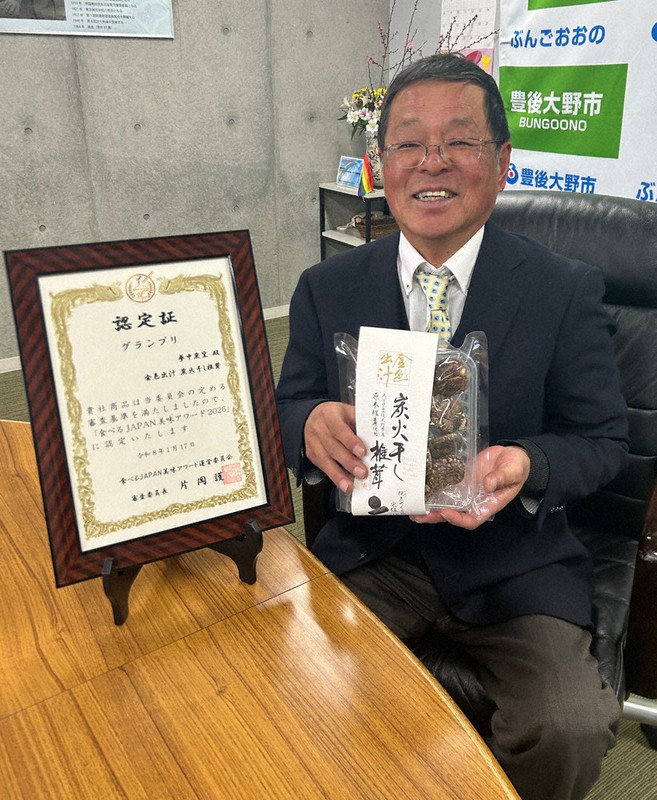 有名店のシェフらが魅力ある食品を発掘する企画「食べるJAPAN美味アワード2026」(国税庁など後援)のグランプリに、大分県豊後大野市で干しシイタケを生産する夢中炭窯(むちゅうすみがま)の「金色出汁(こんじきだし) 炭火干し椎茸(しいたけ)」が選ばれた。炭火でじっくりと乾燥させた芳醇な香りと、出汁の豊かな味わいが高く評価された。【岡田愛梨】