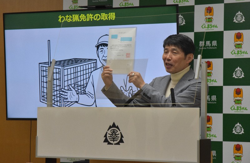 山本一太知事は19日の定例記者会見で、わな猟免許を取得したと明らかにした。今後は出没が相次ぐクマなどのわな猟現場を手伝いたいという。