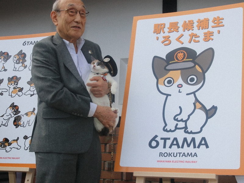 「猫の日」の22日、「ねこ駅長」で知られる和歌山電鉄貴志川線の貴志駅(紀の川市)で、駅長候補生として仲間入りした「ろくたま」のキャラクターがお披露目された。
