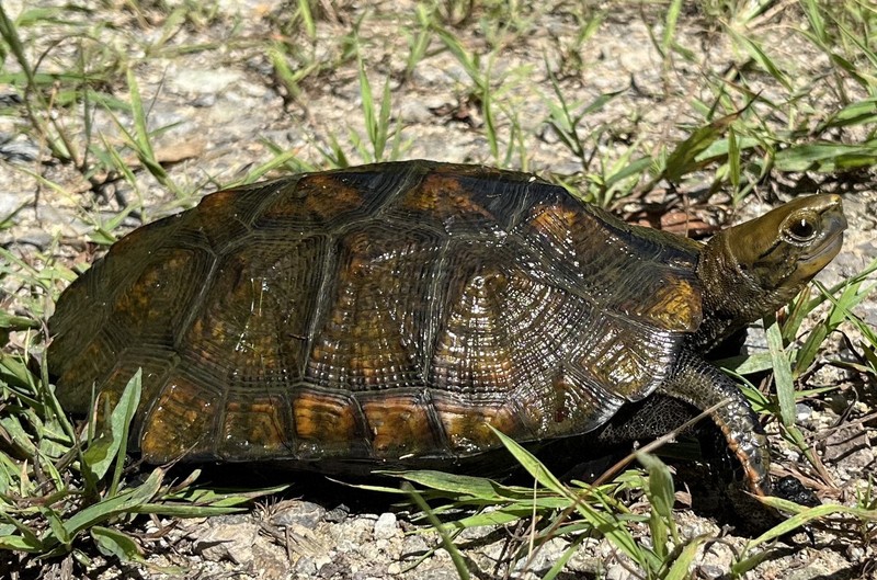 A ニホンイシガメは、ペットとしての乱獲や、特定外来生物アライグマによる捕食などの影響で個体数が減っています。