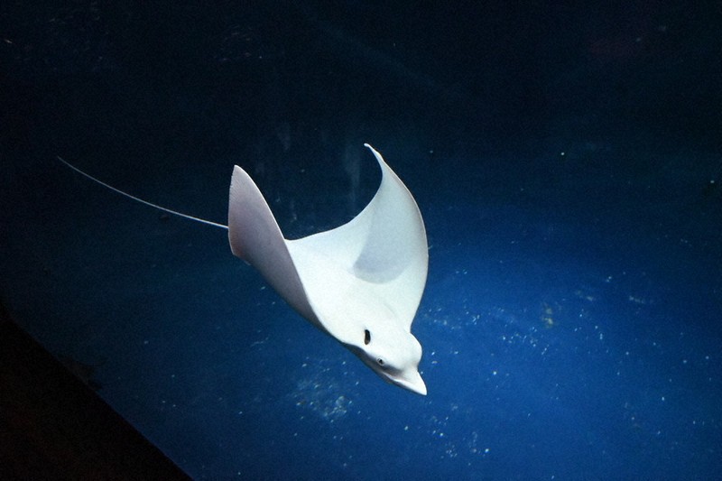 大分マリーンパレス水族館「うみたまご」(大分市)で、全身真っ白の珍しいマダラトビエイが、来場者の目を引いている。