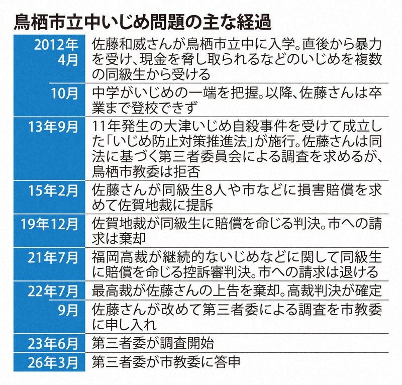 佐賀県鳥栖市の佐藤和威(かずい)さん(26)が市立中1年だった2012年に約7カ月にわたって複数の同級生から暴力を受け多額の現金を脅し取られた問題で、市教委の第三者委員会(委員長=松下一世・佐賀大教育学部非常勤講師)は26日、「甚大な肉体的、精神的苦痛を与える極めて深刻ないじめ」に該当するとする報告書をまとめ、市教委に答申した。被害発生から14年たって第三者委がいじめを認めるのは異例。佐藤さんが同級生や市などに損害賠償を求めた訴訟では司法は市の法的責任を認めなかったが、第三者委は事実確認を徹底しなかった学校や市教委の対応を厳しく批判した。