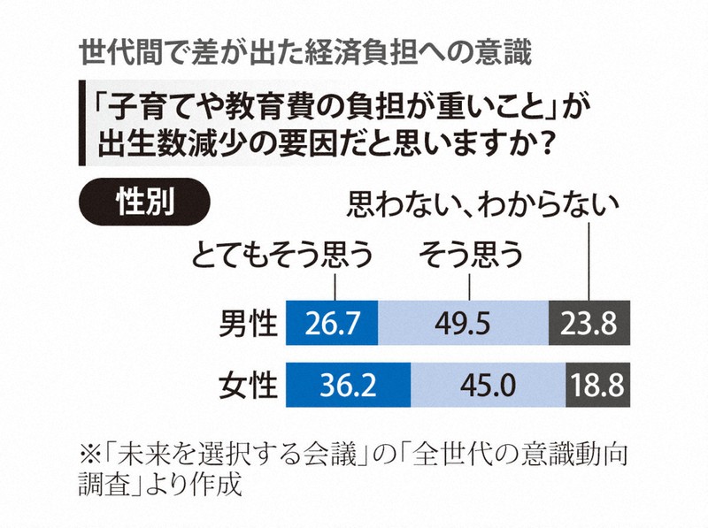 「子育てや教育費の負担が重いこと」を出生数減少の要因と思うと回答した割合は、すべての年代で75~80%程度だったが、このうち、「とてもそう思う」では年代間で差が出た。18~29歳は42・9%、30~39歳は38・8%だったが、年代が上がるごとに低下。50~59歳が25・2%、60歳以上は19・4%だった。男女でも、男性26・7%に対し、女性36・2%だった。