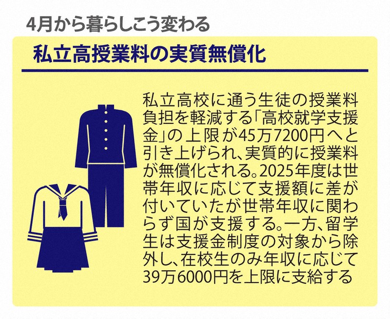 高校授業料の無償化は、家庭の経済状況に関わらず進路選択の幅を広げる狙い。授業料相当の「高校就学支援金」として、公立高は11万8800円、私立高は45万7200円を上限に国が支給し、自治体や学校法人など学校設置者が代理受領する。関連経費はすでに成立した暫定予算に盛り込まれた。